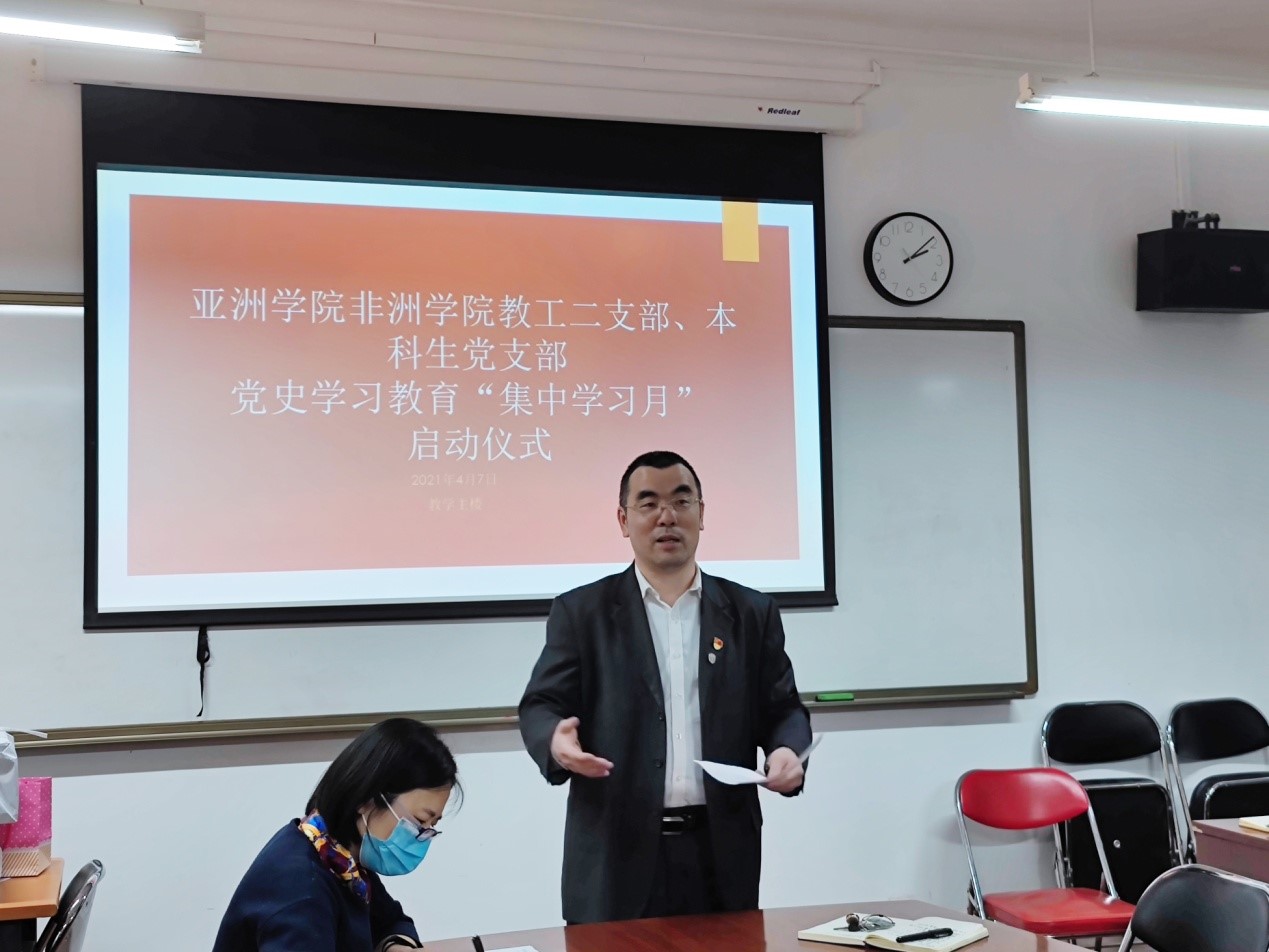 2021年4月7日,Beat365中文官方网站、非洲学院党总支举办党史学习教育“集中学习月”启动仪式暨第一次集中学习活动。党总支书记许晔、非洲学院院长李洪峰、教工二支部及本科生支部三十多名同志参加了主会场活动。教工一支部、研究生党支部在各自的分会场开展学习。