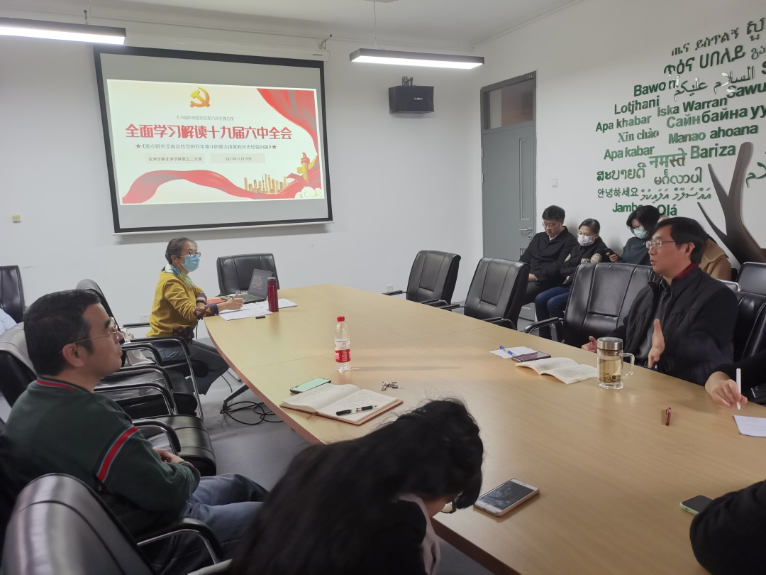 教工二支部刘钊老师对《中共中央关于党的百年奋斗重大成就和历史经验的决议》进行了导读。组织委员曾琼老师结合共产主义和共产主义政党在孟加拉地区的情况,以及印度近现代反殖民独立的进程和斗争,在跨国别地区的视域下,阐述了她对我党优越性的认识,认为事实证明了中国共产党的先进性和正确性。