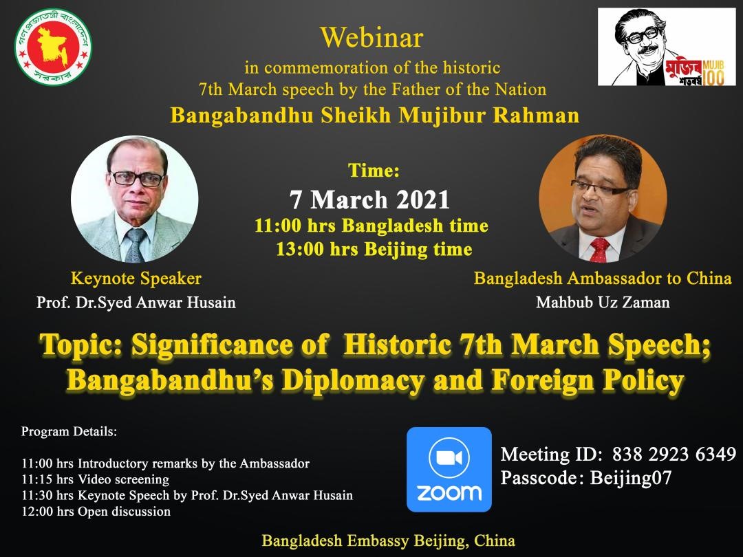 2021年3月7日,Beat365中文官方网站孟加拉语专业师生受邀参加孟加拉国驻华大使馆举办的纪念孟加拉国国父“3月7日历史性讲话”线上活动暨研讨会。