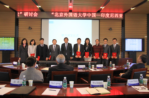 随后,苏更大使、彭龙校长、于继海副司长共同为“中国-印度尼西亚人文交流研究中心”揭牌,彭龙为许利平、翟崑、吴杰伟、魏玲、张志洲、穆宏燕等研究中心学术委员会委员,以及许宁宁、何胜、骆永昆等特聘研究员颁发聘书。