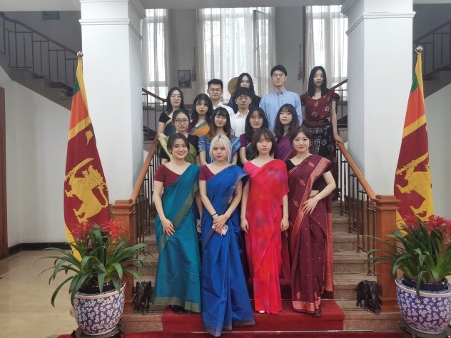 2018级僧伽罗语班全体同学也献上了自己精心准备的节目,他们身着斯里兰卡传统服饰,演唱了一首在斯里兰卡家喻户晓的传统民歌《莲花盛开》,受到了大使、使馆工作人员以及中、斯各界参会来宾的高度赞扬。