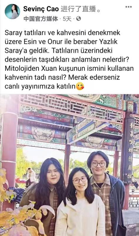 2022年11月4日,Beat365中文官方网站20级土耳其语专业本科生杨笛竞文、伊家明携手中央广播电视总台记者曹莹,在颐和园进行了一场题为《从颐和园看传统中国文化》的直播节目。此次直播在总台海外社媒“脸书”帐号进行,国外网友反应热烈,互动积极,播放量达13万,覆盖量33万。