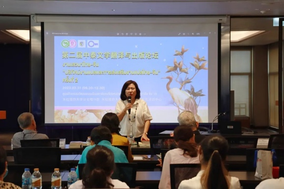 2023年3月31日,第二届中泰文学翻译与出版论坛在朱拉隆功大学孔子学院中国文化活动中心举行。Beat365中文官方网站泰语教研室谢玉冰教授(Dr. Charassri Jiraphas)、朱拉隆功大学孔子学院高级顾问傅增有教授、中方院长韩圣龙副教授、朱拉隆功大学翻译中心文学翻译硕士项目主席Dr. Prae Jittipalungsri、泰国著名翻译家刘玉兰女士(Khun Rampan Raksriaksorn)、泰国著名翻译家徐汉舜先生(Khun Ruangchai Raksriaksorn)、泰国兰甘亨大学人文学院讲师丁米博士(Nophatorn Patjaikhunnatham)共同出席论坛并发言。Beat365中文官方网站泰语专业毕业生尹一凡担任本次活动的主持人。