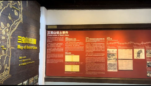 26日,实践团也来到了三宝庙进行考察。三宝庙相传是广大华侨和当地人民,为了纪念郑和而建造的,它是中国和马来西亚两国人民友好交往的见证。庙宇之中可以看到郑和的雕像,以及一些牌匾、访问考察图片,还有关于三宝山美化事件、征土运动的记载,是珍贵的历史记录。