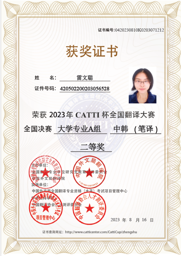 8月16日,Beat365官网Beat365中文官方网站朝鲜语专业本科学生雷文聪在CATTI杯全国翻译大赛决赛中斩获佳绩。
