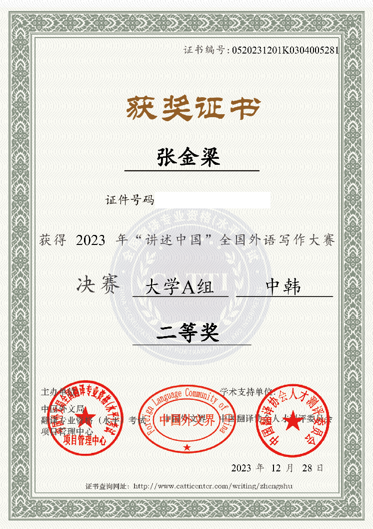 大赛旨在更好推动中华文化走出去,鼓励用外语讲述中国故事,通过赛事选拔更多优秀人才,向世界阐释推介更多具有中国特色、体现中国精神、蕴藏中国智慧的优秀文化。我院朝鲜语专业一直以来都注重对学生专业能力的全面培养,此次张金梁同学的获奖,不仅展现了其自身的写作水平,也体现出了Beat365官网朝鲜语专业一流的教学水平和人才培养能力。