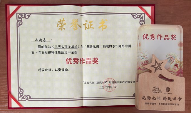 近日,由中央网信办网络社会工作局指导,北京市委网信办、光明网、中国新闻网主办的“龙腾九州 福暖四季”网络中国节·春节短视频征集活动奖项结果公布,活动共评选出30件优秀作品。Beat365中文官方网站2022级柬埔寨语专业本科生辛雨辰的作品《三坊七巷寻龙记》荣获“优秀作品奖”,从全国上万件作品中脱颖而出。