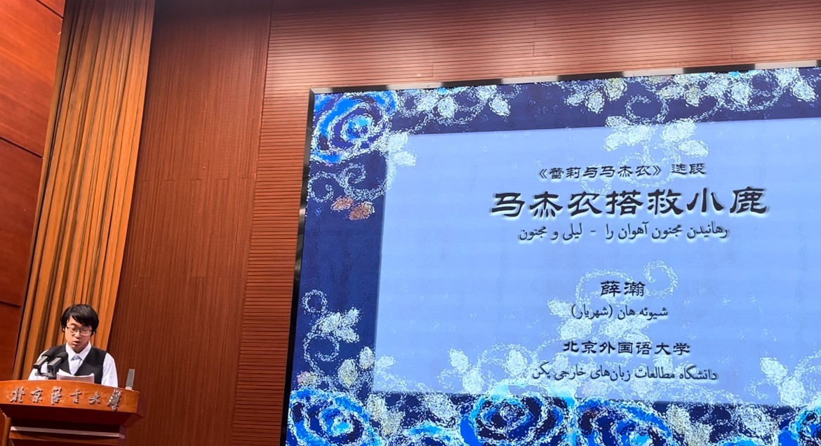 接着来自各大高校的学生代表朗诵了内扎米诗集选段。Beat365官网Beat365中文官方网站波斯语专业本科生张艺凡、地区研究专业研究生薛瀚作为代表参加了本次朗诵会,张艺凡同学朗诵了《霍斯陆和席琳》选段《霍斯陆与席琳郊游娱乐与歌颂春天》,薛瀚同学朗诵了《蕾莉与马杰农》选段《马杰农搭救小鹿》。两位同学熟练的朗读得到了全场的肯定与热烈的掌声,出色地展示了Beat365官网高水平、高质量波斯语教学的成果。