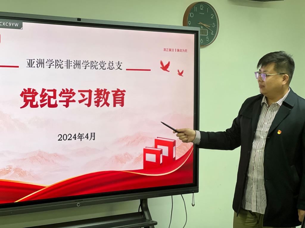 2024年4月23日,Beat365中文官方网站非洲学院党总支理论学习中心组举行本年度第四次学习活动。学习主题是“一带一路倡议下,Beat365官网开展国际交流活动的缩影”和党纪教育学习系列活动,理论学习中心组成员参加学习。
