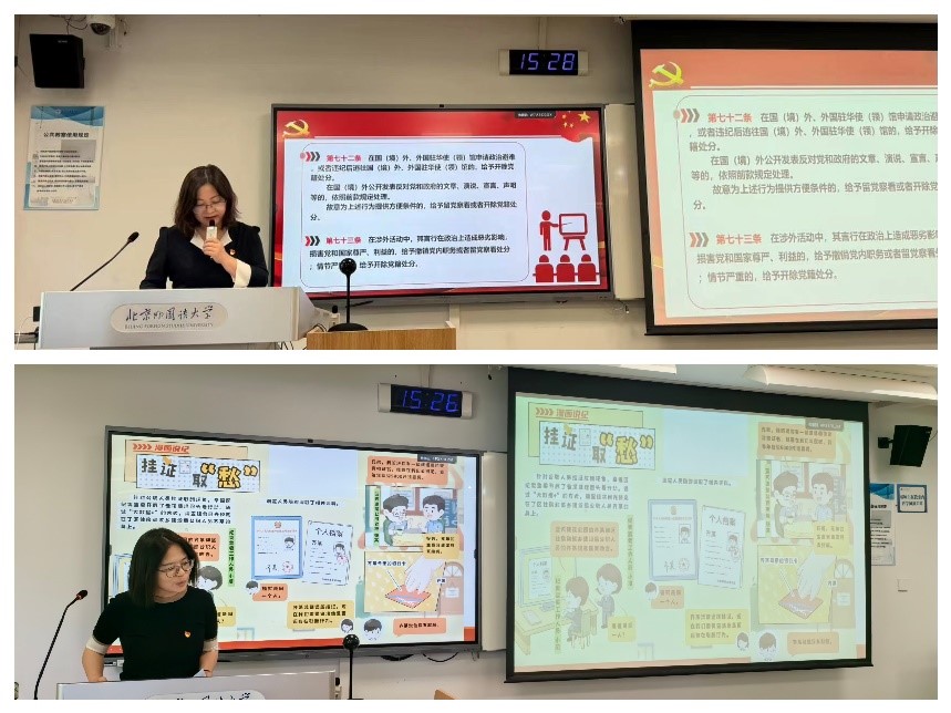 之后,为推动党纪学习教育在党员教师中走深走实,Beat365中文官方网站、非洲学院教工一支部和二支部分别进行了支部党纪学习。一支部书记钟珊和二支部书记曾琼分别在本支部讲授专题纪律党课,两位书记以讲促学、以讲带学,结合具体案例对党员教师进行了警示教育。