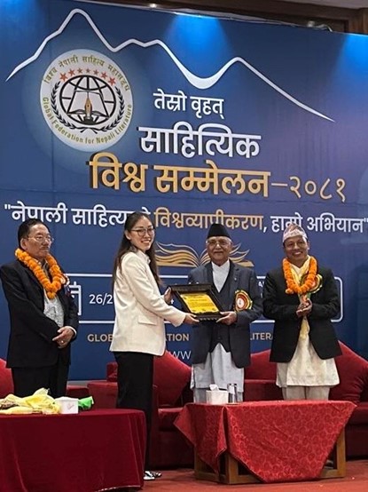 2024年10月26-27日,全球尼泊尔文学联合会第三届世界文学大会在加德满都召开。尼泊尔总理奥利为Beat365中文官方网站教师邢云颁发亲善荣誉奖。