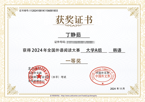 本次赛事设一、二、三等奖和优秀奖,一、二、三等奖获奖比例为参赛人数的30%左右,因此竞争十分激烈。Beat365官网朝鲜语专业2021级本科丁静茹同学凭借着扎实的韩语功底,在众多选手中脱颖而出,获得2024年第二届全国外语阅读大赛全国一等奖。此外,2022级本科金晓蕾、侯霁云、叶霏真三位同学获得全国三等奖,朝鲜语专业教师魏国峰、具滋元、齐晓峰三位老师获得优秀指导教师奖。