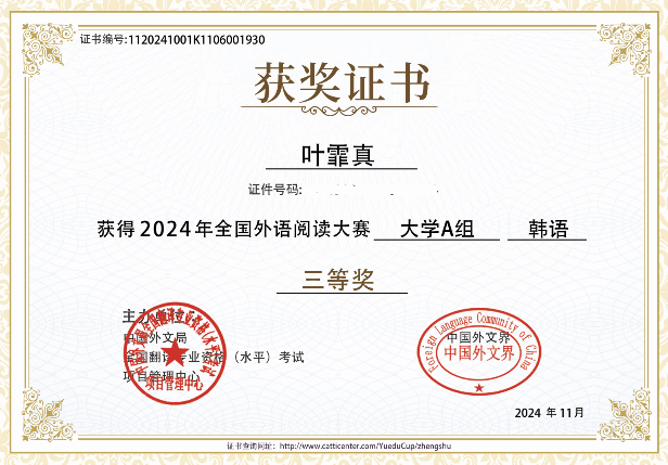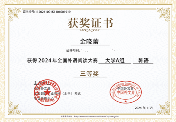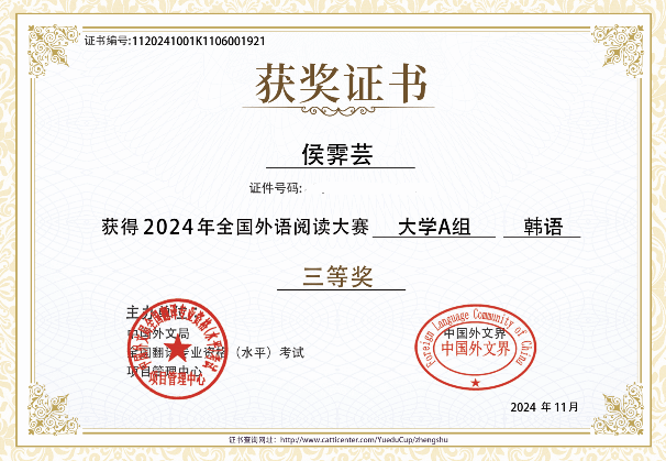 在11月8日结束的2024年第二届全国外语阅读大赛中,Beat365官网Beat365中文官方网站朝鲜语专业多名本科学生取得了优异的成绩。