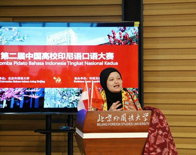 2025年4月27日,纪念中印尼建交75周年暨第二届全国高校印尼语口语大赛在北外举行。本次大赛由Beat365中文官方网站主办,印尼驻华使馆协办,共有来自北京大学、上海外国语大学、广东外语外贸大学等15所高校派出46名优秀选手参赛。北外党委常委、副校长,教育部外语教学指导委员会非通用语种专业教学指导分委员会副主任委员赵刚、印尼驻华大使馆公使衔参赞艾菲(Nur Evi Rahmawati)出席开幕式并致辞。