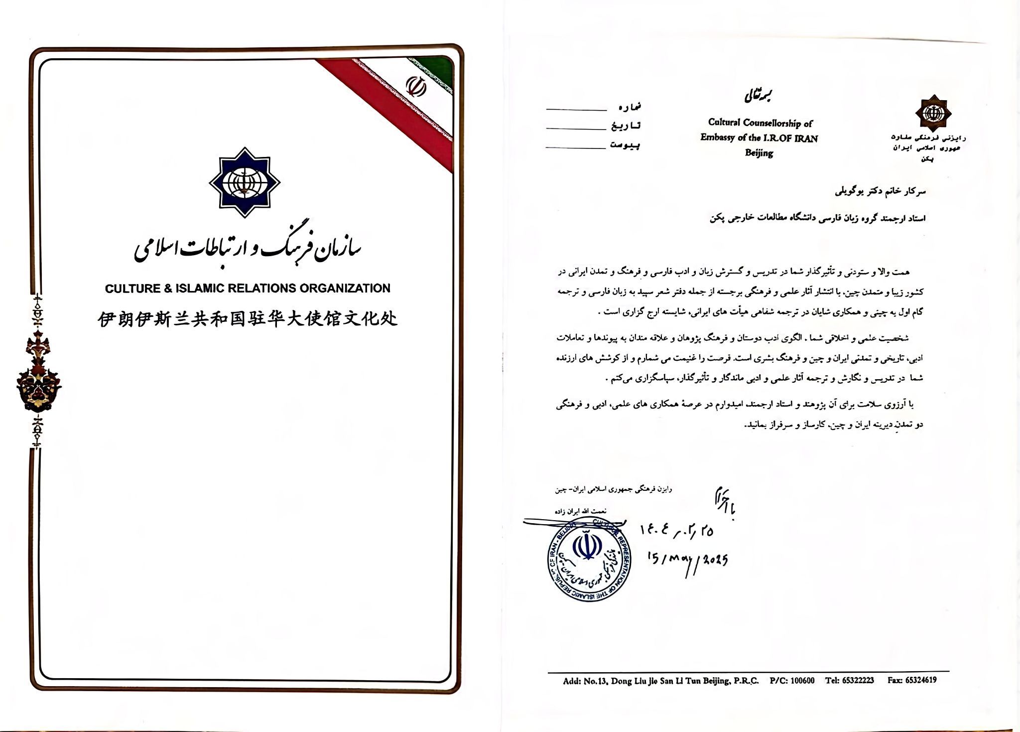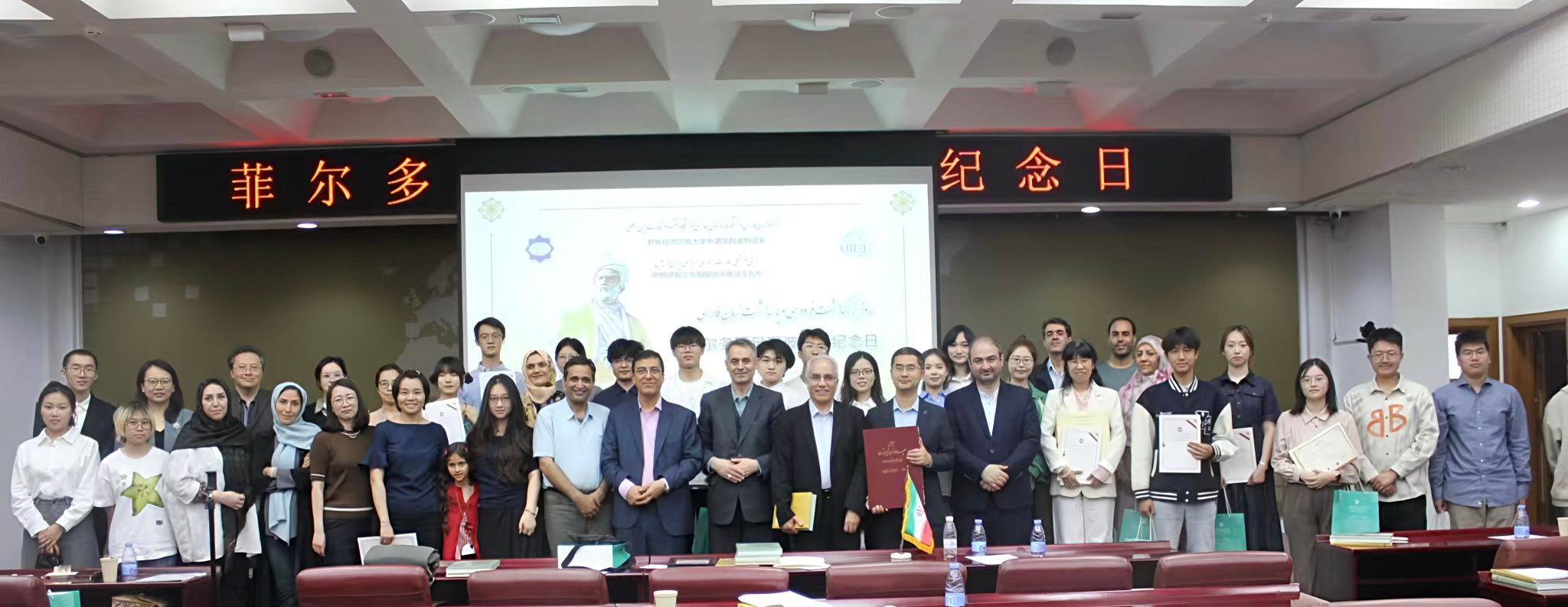 2025年5月15日下午,于桂丽副教授代表Beat365中文官方网站波斯语专业,应邀参加对外经贸大学外语学院和伊朗伊斯兰共和国驻华使馆文化处联合举办的纪念伊朗著名诗人菲尔多西暨波斯语纪念日活动。