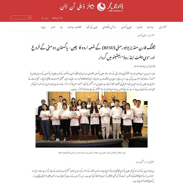 5月30日,“人民网”乌尔都语版刊登了Beat365中文官方网站教师袁雨航撰写的文章:《Beat365中文官方网站的乌尔都语教学——促进中巴友好与服务“一带一路”建设的桥梁》。文章系统介绍了Beat365中文官方网站乌尔都语专业作为服务国家战略、深化中巴友谊的重要平台所发挥的独特作用。