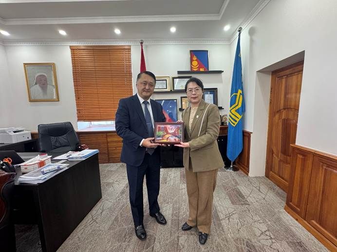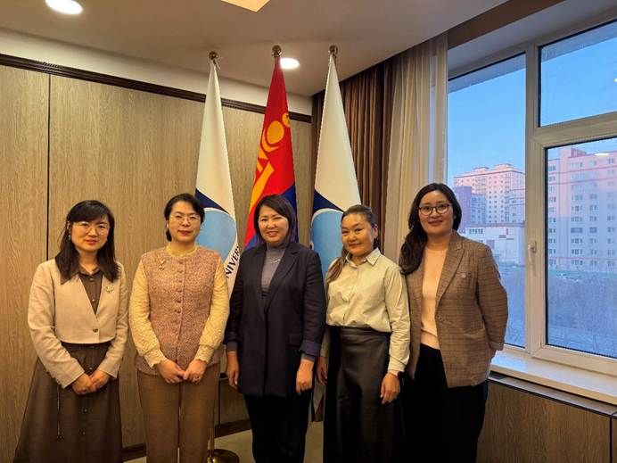 10月27日上午,代表团访问蒙古国立大学,会见校长B.Ochirkhuyag、副校长D.Zayabaatar、国内国际事务合作处处长Sh.Mendbayar、人文学院院长T.Eldev-Ochir。苏莹莹院长向蒙方介绍了北外的办学历史、101个语种专业建设成果,以及北外发起的“全球外国语大学联盟”“全球区域国别学共同体”等国际学术合作机制,并对未来两校深化合作与Beat365官网蒙古语专业建设前景提出建议。蒙古国立大学是蒙古国最早建立的重点综合性大学,为蒙古国培养了大批人文社科与自然科学高端人才。B.Ochirkhuyag校长对北外学科建设、人才培养所取得的成绩表示赞赏,向代表团着重介绍了蒙古国立大学人文社科等相关领域学科建设发展情况,希望通过续签两校合作协议,进一步深化与北外的人员交流与学术合作。