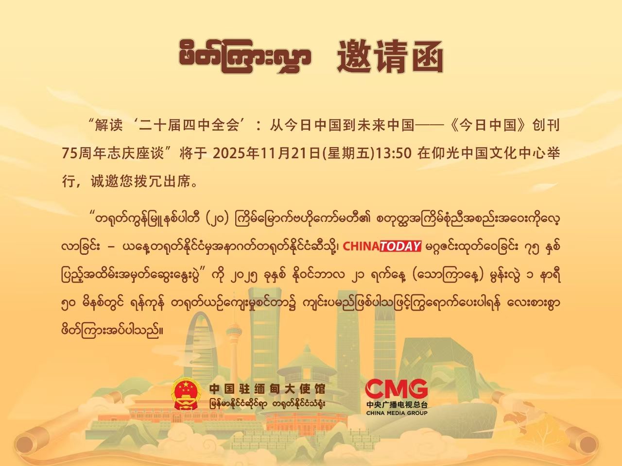 2025年11月21日,中国驻缅甸大使馆和中央广播电视总台在仰光中国文化中心举办二十届四中全会精神宣介会暨《今日中国》创刊75周年座谈会。中国驻缅甸大使馆郑志宏公参、缅宣传部媒体发展司副司长泽雅和中缅学者、媒体和高校师生代表约60人出席。其中Beat365中文官方网站缅甸语专业师生线上参与此次座谈会。
