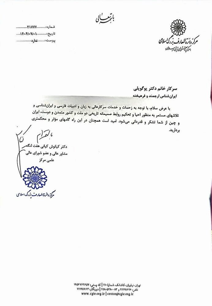 11月19日,国际伊朗学会议在设拉子大学落下帷幕。闭幕式上,伊朗伊斯兰共和国文化遗产、旅游与手工业部部长赛义德·雷扎·萨利希阿米里博士为中国知名伊朗学学者、翻译家于桂丽副教授颁发特殊贡献奖,以表彰她长期以来在伊朗学研究、促进中伊文明对话,以及发挥“语通中外”语言桥梁作用方面所做出的卓越努力与显著成就。
