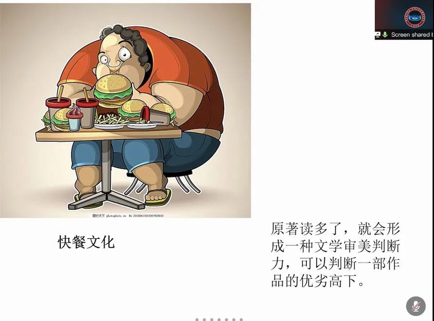 在讲座的第二部分,穆教授指出树立课外阅读的具体目标是另一关键。不同于高中的系统化、一致化教学,大学生活中,同学们有更多时间可供自我调配。“专业学习之余,如果大家分一些时间给阅读,或许会收获意想不到的精神愉悦感。”随后,教授进一步明确这里所谈的阅读对象绝非碎片化的快餐文化,而是能培养文学审美判断力的原著作品。