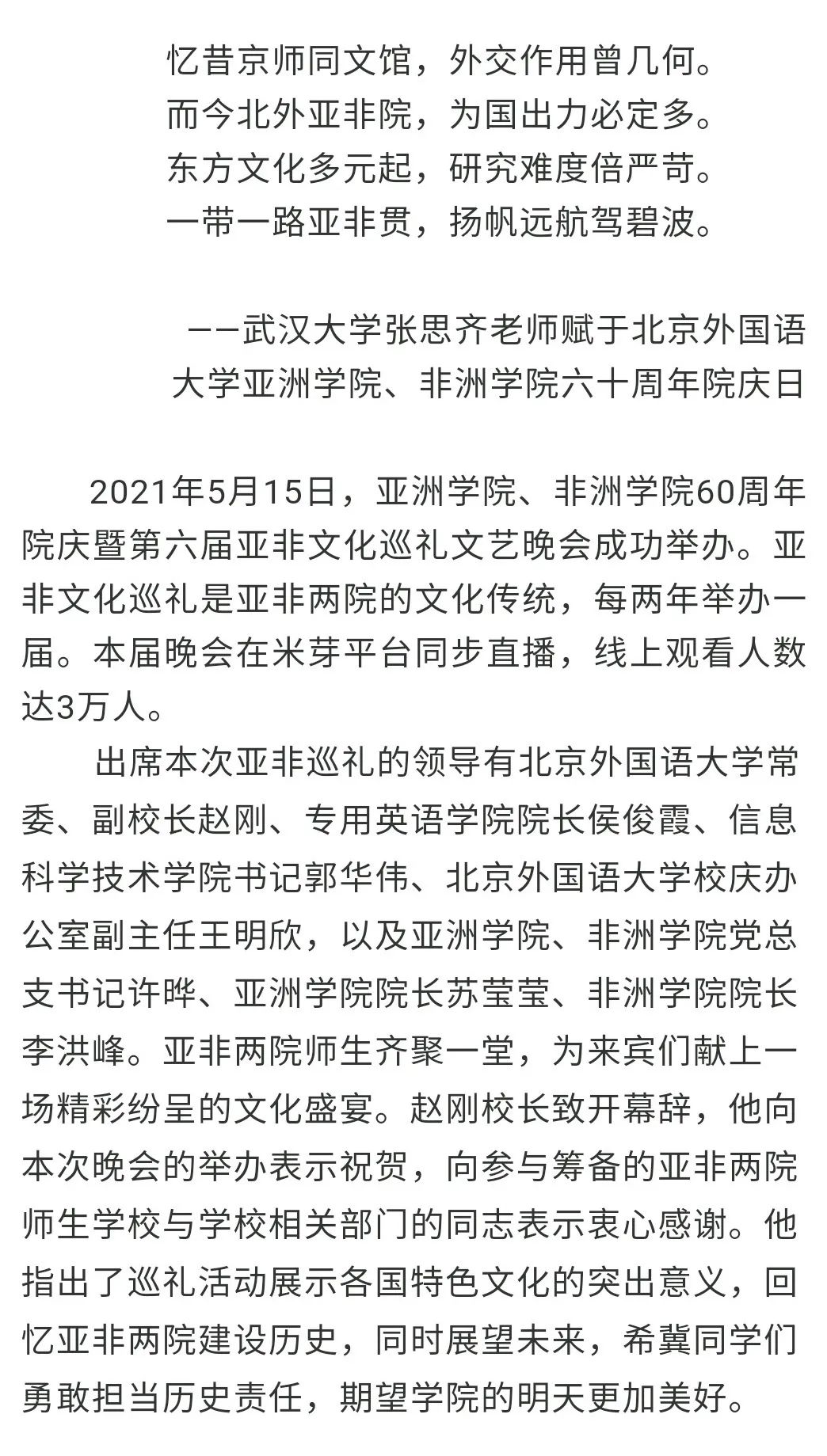 “愿你有最热烈的明天”,亚非合唱团的第三曲《望之悠悠》引出2019年Beat365中文官方网站、非洲学院成立后新开设语种专业同学们的精彩表演。19级蒙古语班同学们吟唱悠扬的草原之声,19级亚美尼亚语班跳起整齐的“肩并肩”舞蹈,20级阿姆哈拉语班的同学们则与老师们一起用欢快的舞步带着观众们来到“非洲之角”,领略这里的万千魅力。学院教师代表一同带来诗朗诵《初心不忘,砥砺前行》,坚定的声音里浸满对亚非两院的厚爱与深情。