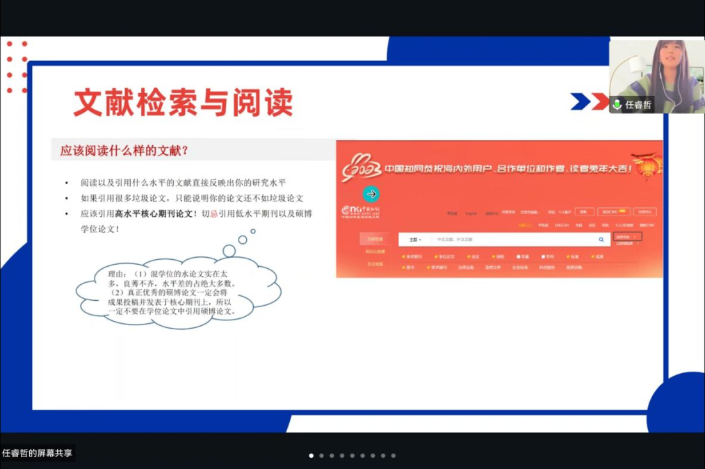 首先进行分享的是任睿哲同学,她负责的项目内容是通过探索后冬奥时期韩国冰雪行业发展特点与路径,为我国后冬奥时期冰雪行业运营的可持续发展提出可行性建议。任同学主要从项目选题、研究过程、文献的检索与阅读三个方面进行了详细的分享。在文献检索与阅读方面,任睿哲同学指出应该引用高水平核心期刊论文,并分享了如何在知网、Google等平台进行文献检索的经验。任同学还建议同学们可以利用Excel表格对所检索的文献进行汇总总结,以加深对文献的理解,提高文献的检索效率。