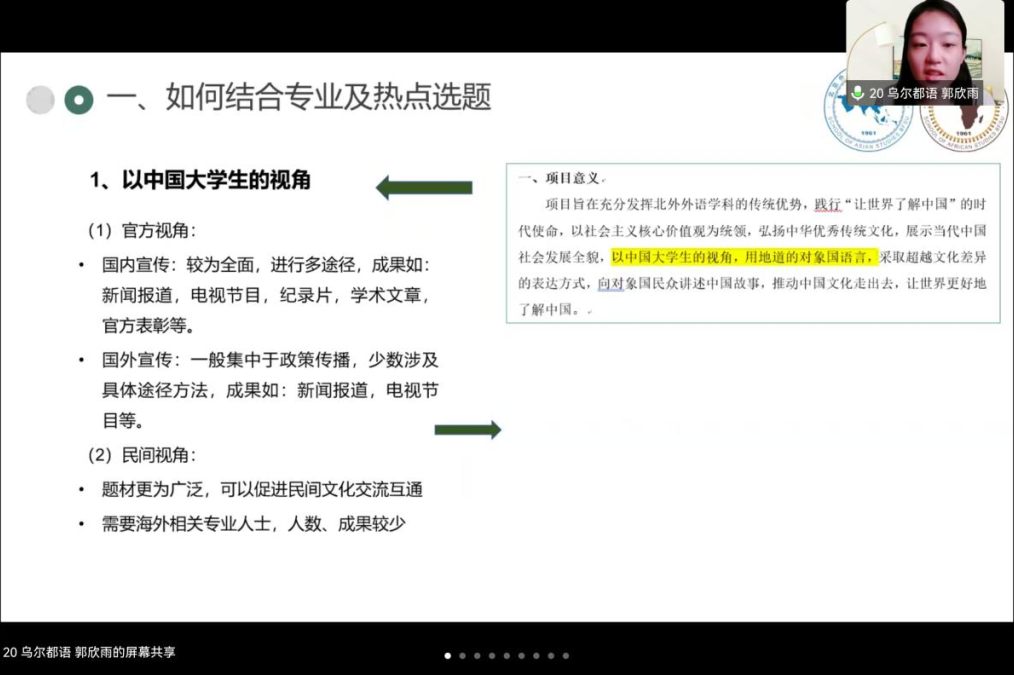 随后进行分享的是郭欣雨同学。郭欣雨同学负责的项目内容是以乌尔都语系列微记录片的方式向巴基斯坦展示中国脱贫攻坚的经验及良好的中国形象。郭欣雨同学主要从如何结合专业及热点选题、如何撰写项目申报书、如何安排项目具体进度三个方面分享了她的经验。针对“用外语讲述中国故事”专题该如何确定选题,郭欣雨同学建议选题应体现中国大学生的视角,运用地道的对象国语言,以小见大,重在讲述中国故事。分享最后,郭欣雨同学鼓励大家做自己真正想做、喜欢做的项目,享受与团队一起合作的过程。